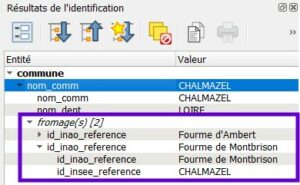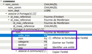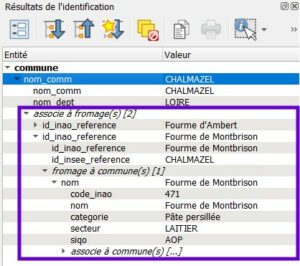 Pour illustrer ces nouveautés, nous prendrons l’exemple de 2 tables « commune » et « fromage ». Une table « associe » permet d’affecter un fromage à une commune. Le paramétrage des 2 relations « fromage(s) » et « commune(s) » permet à QGIS d’exploiter ce lien.