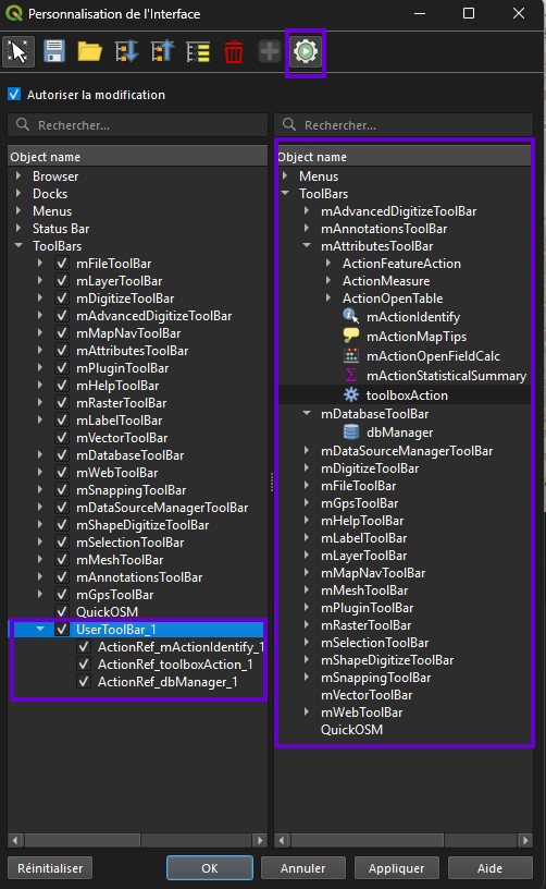 Il y a maintenant la possibilité sur Qgis dans le menu « Préférences » puis « Personnalisation de l’interface » de créer une nouvelle barre d’outil, de la nommer et d’ajouter par un simple glisser-déposer les boutons qui la composent via le « panneau d’actions ».